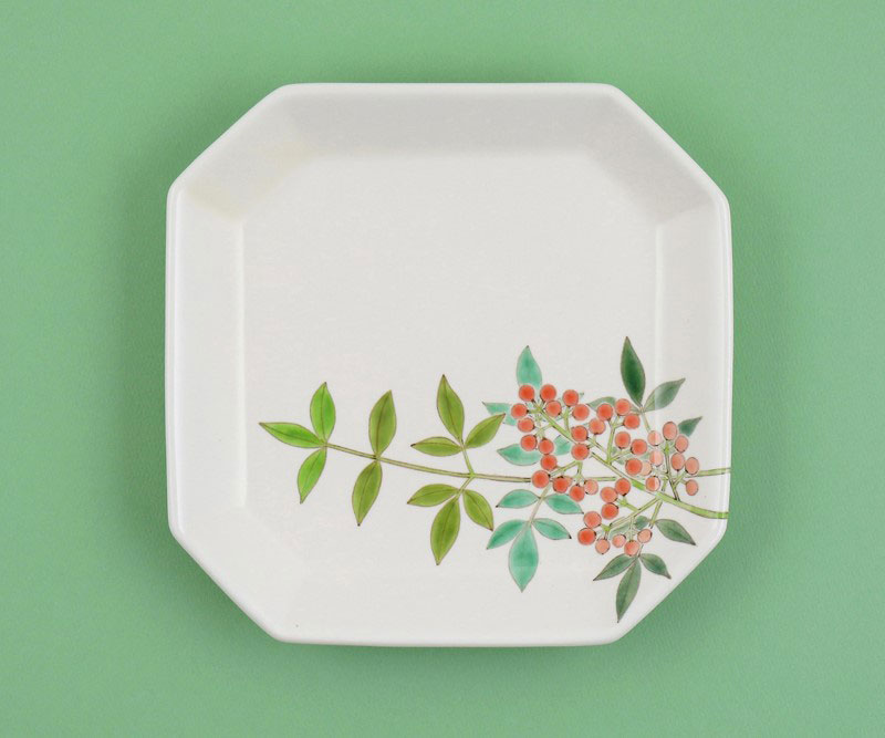 「色絵南天四角隅切皿」2023年